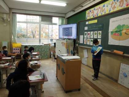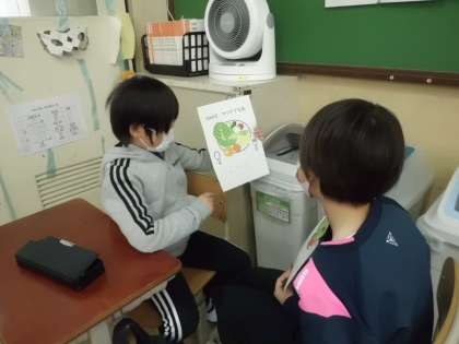 2年生の英語活動の時間,世界にたった一つの“My salad.”を紹介し合いました。初めは,隣の席の友達と・・・。次は,教室内を歩いて紹介する友達を見つけながら・・・。そして最後は,みんなの前で・・・。