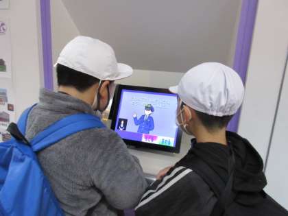府警広報センターでは,指令室など実際に警察の方が,仕事をされている様子を見学しました。見学の中で,110当番がかかってくるのが2分1回という説明を聞き,びっくりしていました。