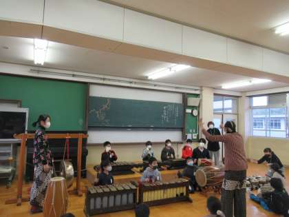 楽器の演奏法を聞き,音を奏でます。そして,教えていただいたように演奏すると,オリジナルの曲ができ上がりました。楽器だけでなく,歌い方も教えていただき,楽器の音に合わせてリズムに乗りながら歌声も響かせていました。