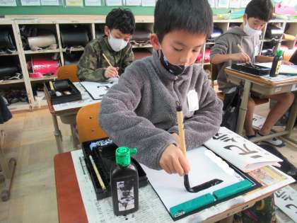 書写の学習では,書き初めの「元気」を書きました。筆遣いに気をつけて書いた文字。文字の様に元気に書くことができました。