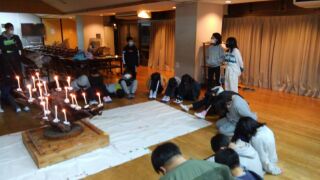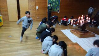 「燃えろよ,燃えろ」を歌い,「ハンカチ落とし」や「ウインクキラー」などゲームを楽しんでいます。