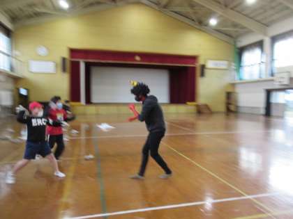 子どもたちは,「おにが来た時用に!」と朝に新聞紙を丸めたものを用意していました!