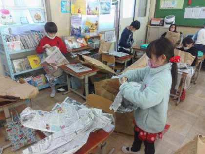 その後,新聞を中に入れて,ぷっくらふくらむように作業を進めています。