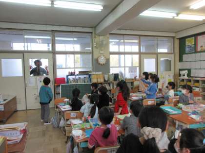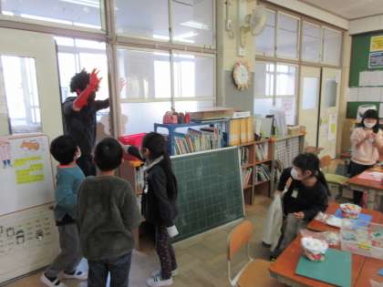 2月3日の節分の日に,赤おにさんが1年1組の教室をのぞいてくれました。「おにがいる!」突然の出来事に,最初はみんな驚いて,しばらく固まっていましたが,すぐに笑顔になって,赤おにさんを見送っていました。赤おにさんは,誰でしょう。帰る時,くつをはきかえる場所で,赤おにさんが誰なのか,みんな分かったようです。