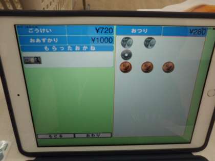 お客さんから商品を受け取るとその商品のバナーをタップすることで購入金額が加算されていきます。お客さんからもらった金額を入力して…お釣りを渡します!