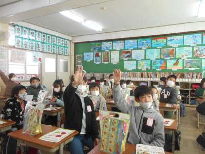 青森りんごについて教えていただきました。りんごの食べ方はスターカットが一番だそうです。皮にはたくさんの栄養が含まれていて,皮ごと食べるのがベストだそうです。また,りんごは降水量が多く,雪の多い地域でよく育つようです。だから青森の気候はりんごを育てるのにとても適しているようです。たくさんのクイズや,ミスりんごさんのお話を聞いてりんごについてたくさん知ることができました。ありがとうございました。