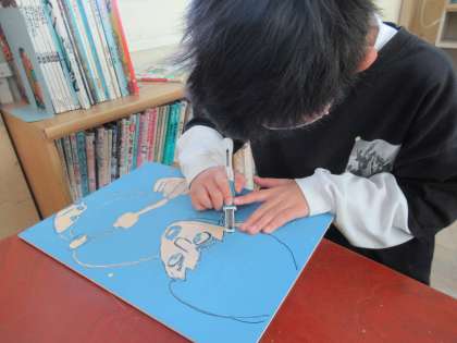 線彫りしたら,顔の面彫りです。顔の周りから彫り,残す線に気を付けながら彫り進めました。どこを彫って,どこを残せばよいかを考えるのが難しいようでした。そして,手の面彫りをしました。顔を彫ったので少し慣れたようでした。