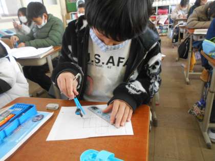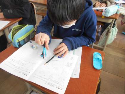 今日は円柱の展開図をかきました。底面の数は2つ,側面の数は長方形1つと分かるのですが,1つ分からない長さが・・・。どうすればよいのかみんなで考えました。側面の長方形の横の長さは,円周と同じになることが分かりスラスラとかくことができました。