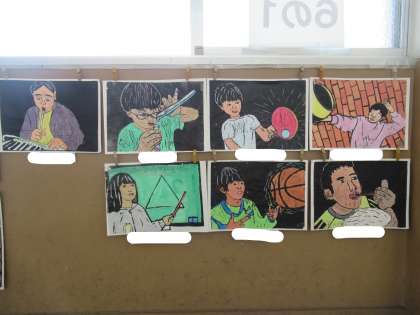 今の自分たちの姿を版画で表現しました。どんなことをしている姿にしようか,どんな表情にしようか,どんなポーズにしようか・・・いろいろな悩み,お気に入りの姿を表現していました。12歳の自分の姿をしっかりと表現することができました。廊下もにぎやかです!