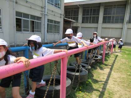 今日は中庭のうんていとタイヤで遊具の遊び方を学習し,みんなで遊具を使って遊びました。握る手は「おさるさんの手」を意識して活動できました。うんていもタイヤも1年生になってから,初めて使ったのでとっても楽しそうでした。