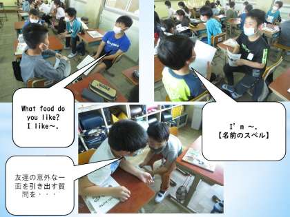 まずは自分の名前のつづりを言えるようにし,友達の好みを聞き出しています。