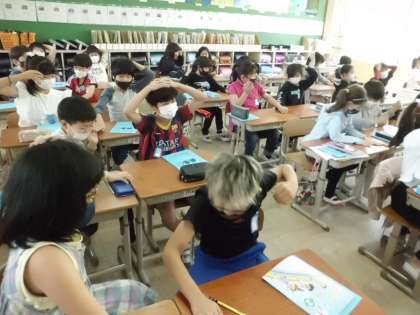 イラストを見ながら,さあ“On your head!”