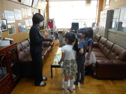 校長室や事務室,職員室などはその教室にいる先生たちとお話しをしたり,質問をしたりしました。学校にある教室やもの,そして人とたくさん触れ合って楽しいがっこうたんけんになりました。