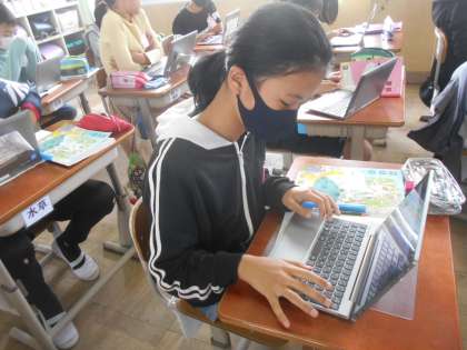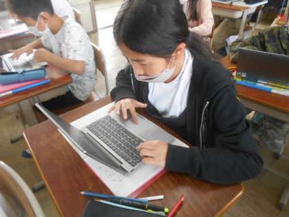 「学級文庫に漫画をおくことに賛成か反対か」「スポーツ観戦をするにはテレビがよいか競技場に行くほうがよいか」などそれぞれのテーマを見つけて話し合いの準備を進めています。聞き手を納得させるように発表の原稿をGIGA端末を使って書いています。