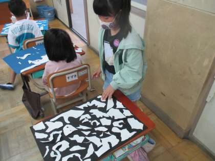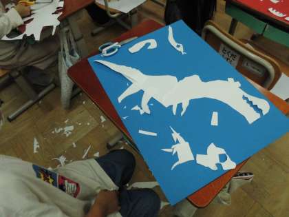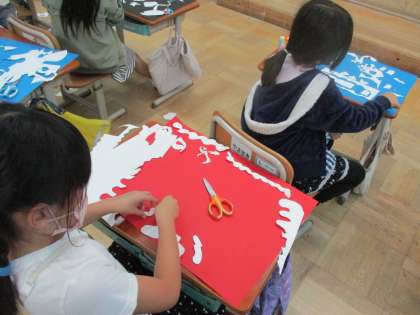 図画工作科の学習では,切ってできた形を使って絵に表す学習をしています。子どもたちは,切った画用紙を組み合わせて,人を作ったり,ロボットを作ったり,動物を作ったり,想像を膨らませていました。