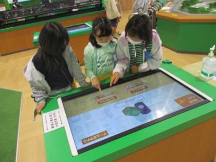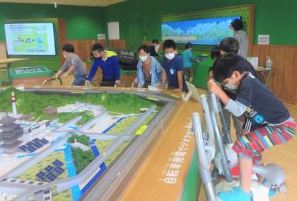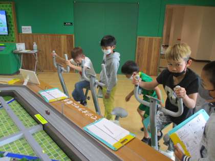 お弁当を食べ終わった後は,広報室の外にある学習ルームでエコについてのクイズや自家発電に挑戦しました。特に,街の明かりをつけたり,小さな電車を動かしたりできる自家発電コーナーは大人気で,順番を待つ列ができたほどでした。