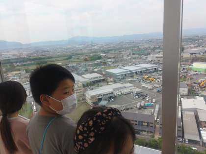 煙突にある展望台にも上りました。地上66メートルに行くと,宇治川が小さく見え,さすてな京都の周りにある関連施設をたくさん確認することができました。また,遠くの方にかすかに見える音羽の杜がある山を見ることもできました。