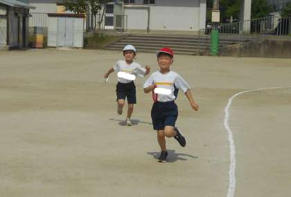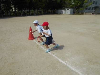 体育科「りれえあそび」では,運動場のトラックを使った半周リレーをしました。初めて小学校のトラックを走って,子どもたちはとっても楽しそうでした。同じチームの友だちだけでなく,他のチームの友だちも一生懸命応援する姿が素敵でした。