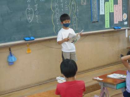 国語科「はなのみち」ではお話を声に出して読む学習をしました。くまさんがしたことやまわりの様子を想像しながら読みました。単元の最後には音読発表会をしました。自分の好きな場面の音読と,好きな理由を発表しました。緊張の中,みんなとっても頑張りました。