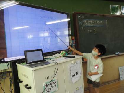 自分のノートを大型テレビに映して,それを基に指し棒を使って説明しています。