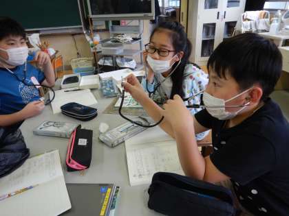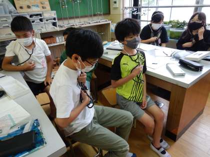 きっちりと正確に拍動数を調べることはなかなか難しかったようですが,自分の心臓の音をしっかりと感じることができていました。友達の拍動数とも比べていました。