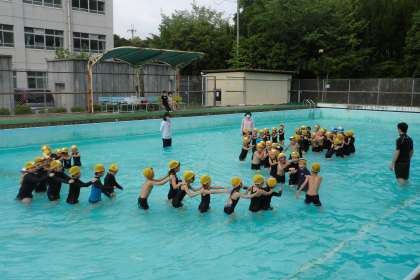 着替え,移動,準備の仕方など一つ一つ確認したことを思い出しながら進めました。少し気温が低く寒さもありましたが,水に入ると子どもたちは元気いっぱい!
