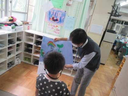 子どもたちが描いたものは「傘」「かたつむり」「かえる」「アジサイ」さらに…雨があがった時の「にじ」など様々です!