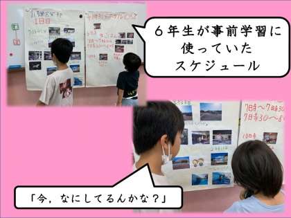 あおぞら学級の子どもたちが修学旅行のスケジュール表を見ながら6年生の様子を思い浮かべいます。