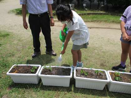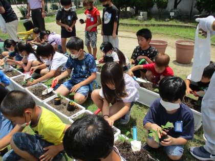 24日には地域のみなさんにお世話になり,プランターに定植をしました。ここまで育った苗を傷つけないように,優しく作業を進めていました。
