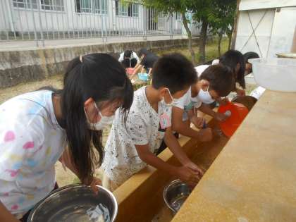 夏を快適に過ごすためにどうすればよいかというめあてをもって学習しています。衣服を洗濯することで気持ちよく,快適に過ごすことができます。現在は洗濯機で洗濯をすることがほとんどですが,手洗いで洗濯をしました。汚れているところを見つけて丁寧に洗っていました。また一つできることが増えました。