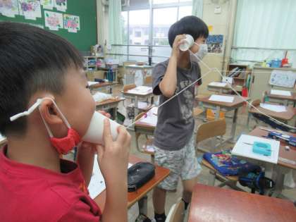 学習のあと,何人でも糸電話ができるのか,また,一人に聞こえないようにするにはどうすればいいのかなどを考え,学習を深めていました。