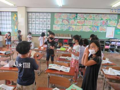 さらに,糸電話で4,5人で話せるかを確かめました。どうなるのかワクワクした様子で糸をつなぐ子ども達。いざ,糸電話のカップに耳をあててみると・・・・・