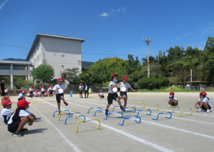 体育参観では,アイディア走でミニハードルを跳んだり,フープをくぐったりしてゴールを目指します。