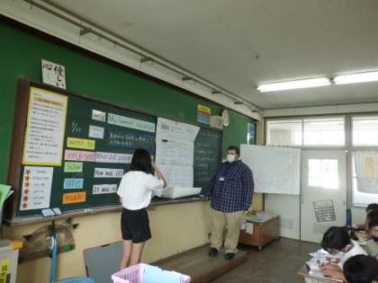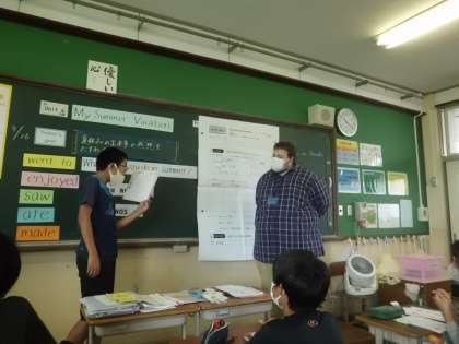 これまでに,夏休みに行った場所・見たものや出会った人・食べたもの・作ったもの・楽しんだことなどについて,伝えたい感情をクラスで出し合い,ALTの先生に英語での表現を教わりました。