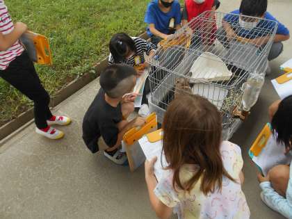 さとやま生活科「いきものとなかよし」では,学校で飼っているうさぎをみんなで見に行きました。子どもたちは,うさぎを見てわかったことや気づいたことをたくさん書いていました。「チョコちゃんは動いたり,持ち上げたりするのが好きなんだ!」「ミルクちゃんの耳はねているね。」など,たくさんの発見があったようです。これからもっと知りたいこともたくさんでてきていました。