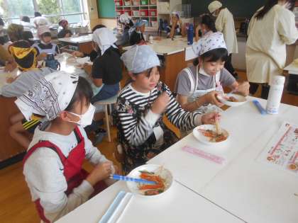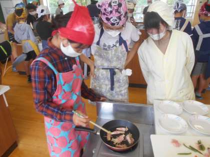 調理実習で野菜のベーコン巻きを作りました。野菜のゆで具合を調整したり,味付けを考えたりしてグループで協力して作ることができました。いろどりも大変よく,とてもおいしくできました。