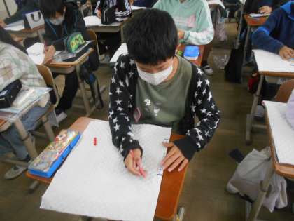 家庭科の学習でナップザック作りをはじめました。今回は布に線を引いて,縫う場所を確認しました。次からミシンで縫っていきます。