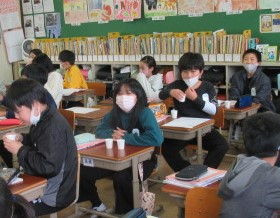 5年生の家庭科では、みそ汁の作り方やだしについての学習をしました。だしの入ったみそ汁とだしの入っていないみそ汁を飲み比べてだしの効果について考えました。「だしが入っていると色や香り、味などが良い」と五感を使って味わいました。その後、調理実習に向けて、煮干しでだしをとる方法や材料の切り方などを確認しました。