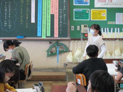 5年1組では,国語科「未来の自分におくるエール 〜伝記を読んで考えたこと〜」を学習していました。学習材「やなせたかしーアンパンマンの勇気ー」からたかしさんは,どんな人物なのか,たかしさんの行動や考え方から自分に取り入れたいところを考えていきます。