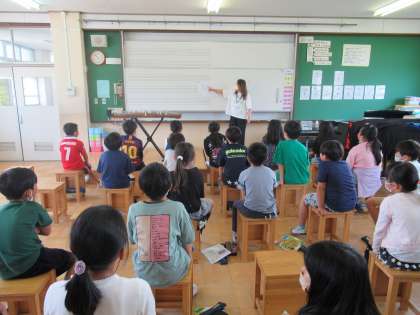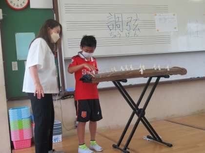 音楽の学習で「琴」の楽器の音色を聴いたり、演奏したりしました。「さくら」という曲の1小節を上手に演奏していました。