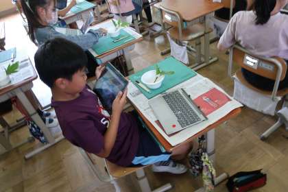 初めて見る苗木に興味津々の様子。葉の形や色などしっかりと観察を行いました!