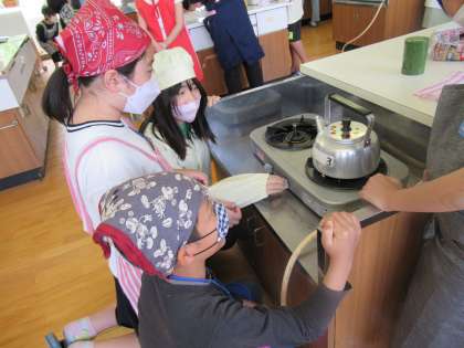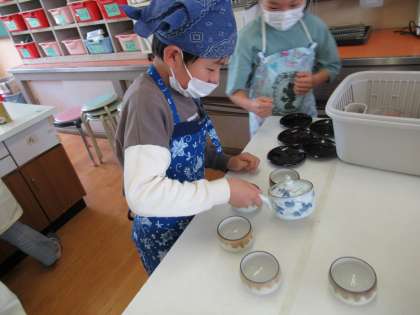 ガスコンロの使い方やきゅうすを使ったお茶の入れ方など班のみんなと協力しておいしいお茶を入れることができました。「お家でもいれてみよう。」初めての調理実習を楽しんでいました。