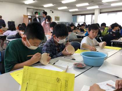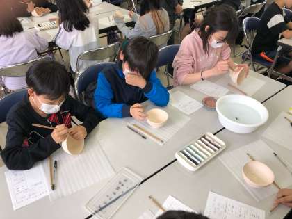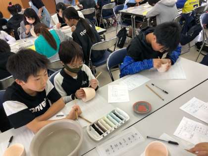 ピーター先生のお話をよく聞いて、お皿、湯呑み、茶碗に思い思いの絵をかきました。