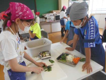 6年生になって初めての調理実習を行いました。朝食のメニューの1つとしていろどり炒めを作りました。また一つ家庭でできることが増えました。