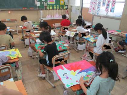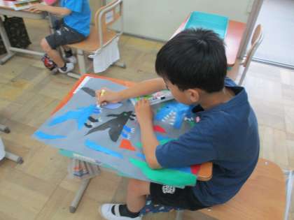 図画工作科「やぶいたかたちからうまれたよ」では、やぶいたかたちが何に見えるか考えて貼り、絵を描きました。