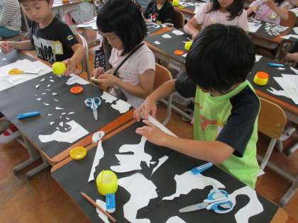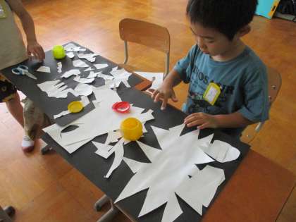 切った形を動かしたり、向きを変えたりして、自分にとって面白いと感じる形を見つけました。早速、友達の作品に興味を持っている子もいました。次の鑑賞会が楽しみです!
