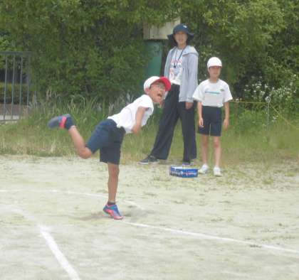 思いっきり振りかぶって…!みんな一生懸命に投げました。去年よりよい記録が残せたようで喜んでいる子どもたちでした。