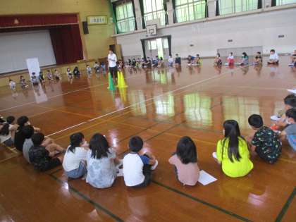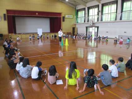 体育館で5年生が「花背山の家」のキャンプファイヤーの練習をしていました。