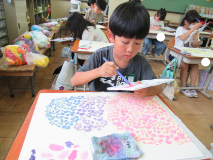 図画工作科『6月のわたしの絵』では、アジサイと自分を描きます。この時間は、下描きしたアジサイに色をつけました。