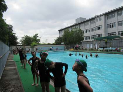体育科「水泳学習」では、浮くことから始めました。そして、初歩的な泳ぎ方ができるように進めています。